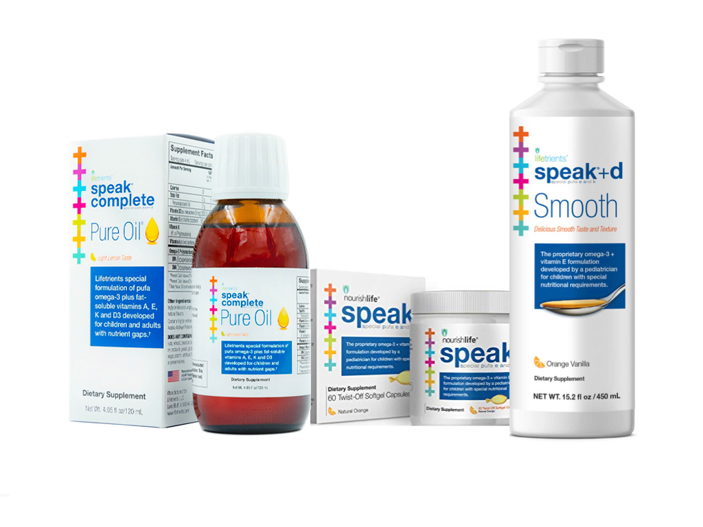 The speak® formulation contains 7 nutrients in precise doses and ratios for families seeking extra nutritional support. Speak is available in four different forms: capsule, twist off capsules, liquid Smooth, and Speak Complete Pure Oil.